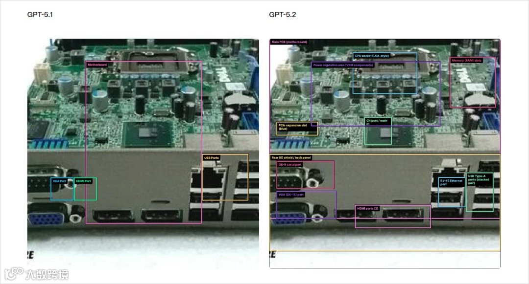 在测试中,即使面对低质量的主板图像,GPT-5.2也能识别主要区域并标注大致位置,而GPT-5.1仅能标注少数几个部分。这一进步使得GPT-5.2能够更好地支持金融、运营、工程、设计等以视觉信息为核心的工作流。