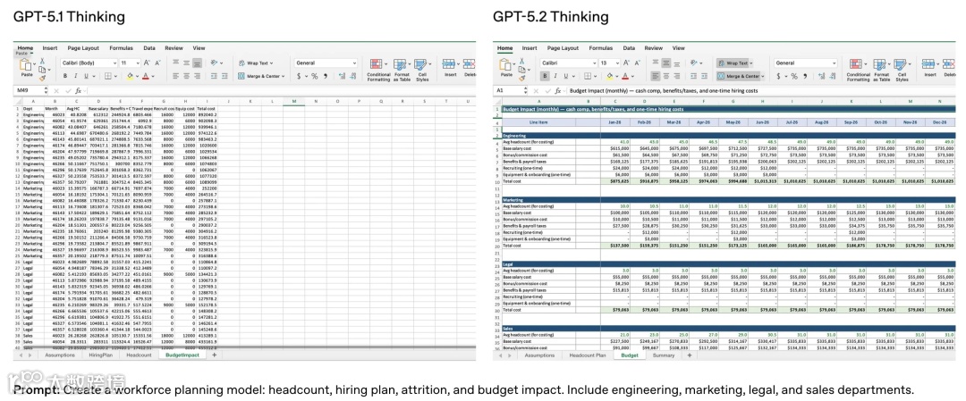 当提示"创建一个人力资源规划模型:人员数量、招聘计划、离职率和预算影响,包括工程、市场营销、法律和销售部门"时,GPT-5.2 Thinking能够生成结构完整、公式正确的专业级电子表格,而GPT-5.1的生成结果则存在多处错误和空白。