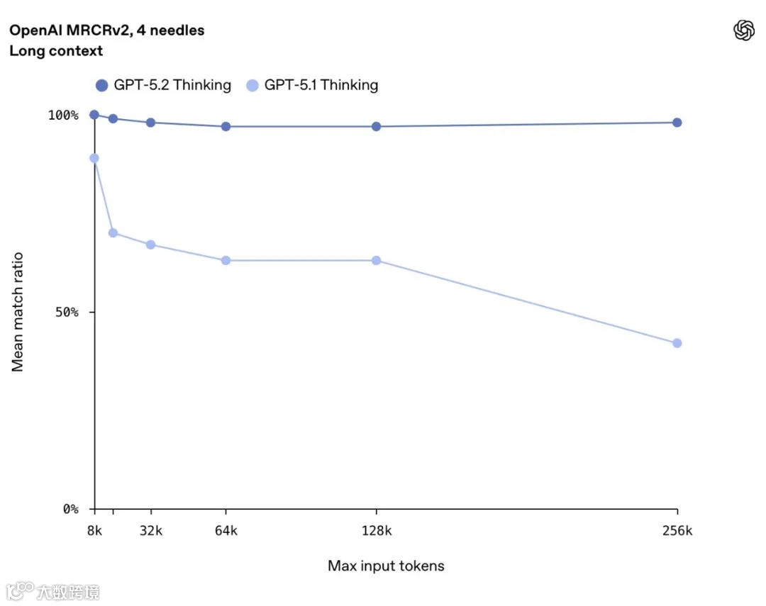 GPT-5.2在长上下文推理方面树立了新标准。新模型支持最高40万token的上下文窗口,在OpenAI MRCRv2测试中表现卓越。在"大海捞针"测试中,GPT-5.2在256k token长度下处理4个信息点的准确率接近100%,而GPT-5.1同样条件下仅有约30%的准确率。