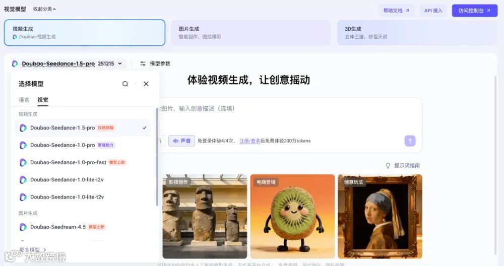 火山方舟体验中心提供最完整的模型体验环境。用户可通过特定网址直接访问,平台提供丰富的模板化玩法,包括京剧角色生成、名画动起来等趣味功能。