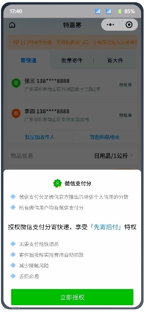 我们采用了微信官方的支付分服务,让你可以“先寄件,后付款”,安全又便捷!