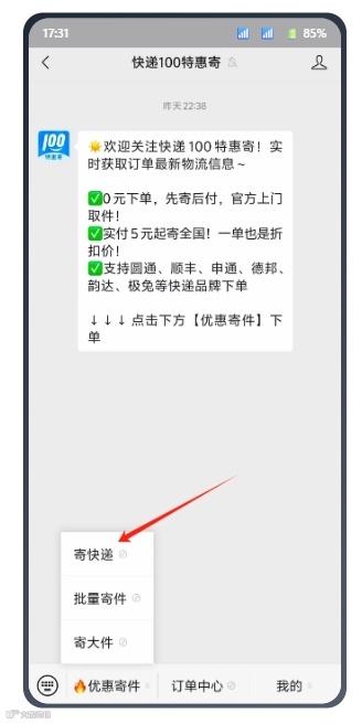 在我们的公众号聊天界面,找到最下方的菜单栏,点击 [优惠寄件],即可一键直达下单小程序!无需下载,无需注册,超级方便!
