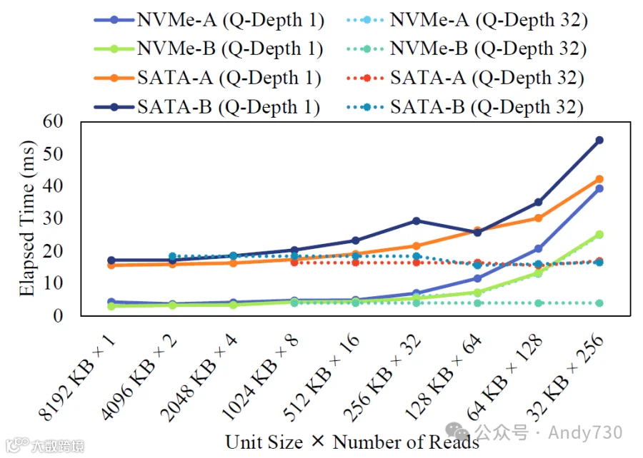 图7展示了从四个SSD中读取8 MB数据所需的时间,取决于读取操作的单位大小。与图4类似,当设备的队列深度设置为1时,读取8 MB数据的经过时间随着读取单位的大小减少而增加。根据结果的回归分析,对于NVMe SSD,每增加一个请求,经过的时间增加85微秒,而对于SATA SSD,每增加一个请求,时间增加136微秒。这些结果涵盖了请求拆分对主机与设备接口、SSD固件和闪存访问时间的影响。在这些因素中,随着单位读取操作大小的增加,闪存访问时间有望减少,这受到上述内部并行性的影响。