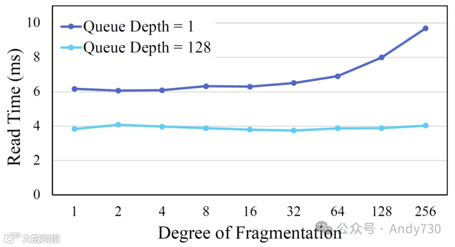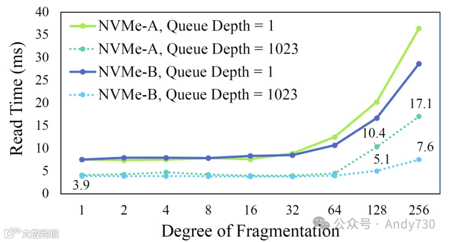 SSD的性能远远高于单个闪存Die,因为它们可以并行操作多个闪存Die。具体而言,NVMe SSD提供65,535个命令队列,每个队列能够排队65,536个命令。即使碎片化导致请求大小减小,无法充分利用Die级并行性,命令队列中的较小闪存操作仍然可以无序处理,从而使大多数Die得到充分利用。这使得SSD在访问小片段时仍能接近其最大潜力。因此,一些研究人员推测,内核输入输出路径和请求分割带来的接口开销对碎片化引起的性能下降的影响大于闪存访问时间。