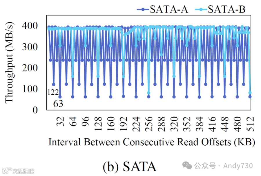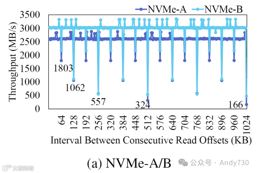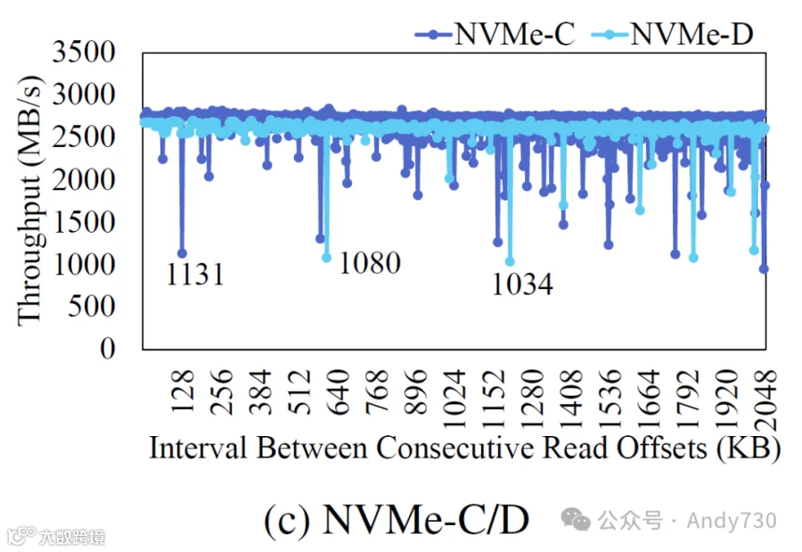 然而,并非所有SSD在一致的间隔下都表现出性能下降,正如前面提到的四款产品所示。图8c展示了NVMe-C和NVMe-D在读取偏移间隔下的性能下降情况。与之前的SSD不同,这两款产品出现下降的间隔并不一定是2的幂。对于NVMe-C,在64 KB和128 KB间隔时注意到性能下降,而随后的下降则在584 KB的倍数下发生。对于NVMe-D,下降发生在604 KB的倍数间隔。SSD的闪存Die分配策略因制造商而异。然而,实验结果确认非顺序页面访问最终导致因高闪存Die级冲突而造成显著的性能降低。