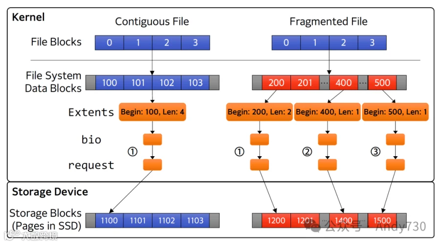 参考资料:Yuhun Jun, Shinhyun Park, Jeong-Uk Kang, Sang-Hoon Kim, and Euiseong Seo. We Ain’t Afraid of No File Fragmentation: Causes and Prevention of Its Performance Impact on Modern Flash SSDs. In Proceedings of the 22nd USENIX Conference on File and Storage Technologies (FAST 24), Santa Clara, CA, February 2024.