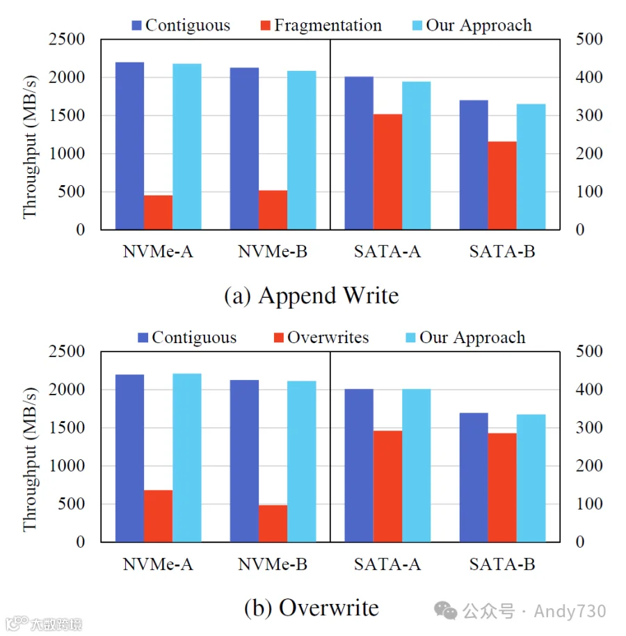 图11b显示了覆盖实验的结果。NVMe SSD的性能下降与碎片化文件相似,性能大幅下降至四分之一。然而,当应用我们的方法时,性能下降减少到与连续情况相比的平均1%。在SATA SSD的情况下,由于前述闪存Die分配粒度的差异,其性能下降较小,但仍显示出27%和16%的性能下降。然而,我们的方法成功实现了与覆盖操作前相似的性能水平。我们的方法在四种SSD上均表现出良好的效果。在我们的方法下,最大性能下降仅为SATA-B的1.2%。