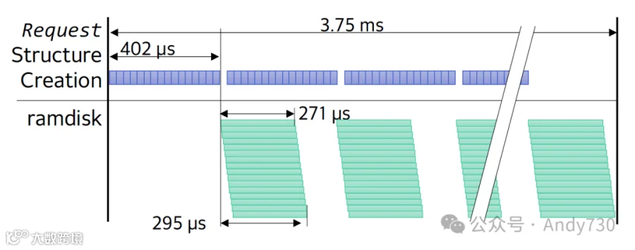 通过这些实验,我们发现即使在极端情况下,由于请求拆分引起的内核I/O路径延迟也仅在几毫秒的水平。此外,我们确认其对实际执行时间的影响因I/O操作的排队而微不足道。