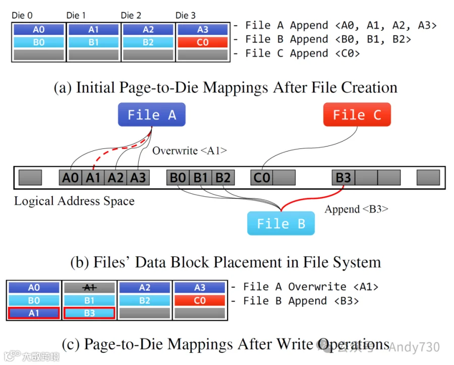 例如,在图2中,文件A均匀分布在四个Die上,因为其四个页面是无干扰地写入的。因此,对文件A的顺序读取将同时在这四个Die上进行,带宽可达到闪存Die性能的四倍。相反,假设对文件B和文件C的写入是交错进行的。由于存储逻辑页面的Die是根据SSD内的写入顺序以循环方式分配的,因此文件B的第三个和最后一个页面都被分配到Die3上。因此,读取文件B的时间是读取理想放置文件(如文件A)所需时间的两倍。
