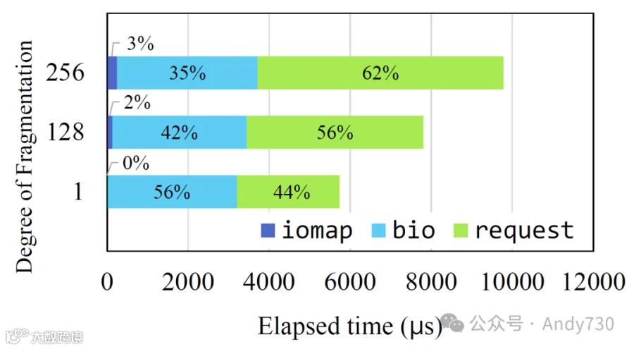 如前所述,文件碎片化导致请求拆分,单个I/O操作被转化为多个设备命令。请求拆分造成的主机端处理时间增加对性能下降的影响在存储设备处理时间较短时更加明显。因此,我们使用ramdisk作为存储设备,测量了由于请求拆分在内核I/O路径中产生的延迟,因为ramdisk具有极短的主机与存储接口及存储介质访问时间。