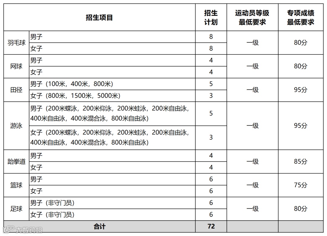 1.我校运动训练专业招生体育专项成绩录取控制分数线:羽毛球、网球、足球不低于80分;篮球不低于75分;跆拳道不低于85分;田径、游泳不低于95分;项目之间、性别之间专项成绩录取控制分数线不进行横向比较。