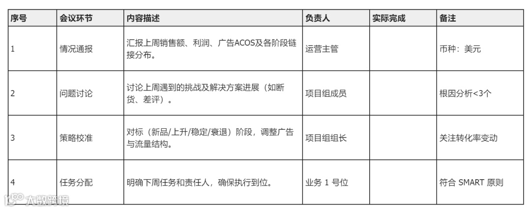 流程要点:开场 -> 数据汇报 -> 问题解决(重点) -> 任务分配 -> 总结。