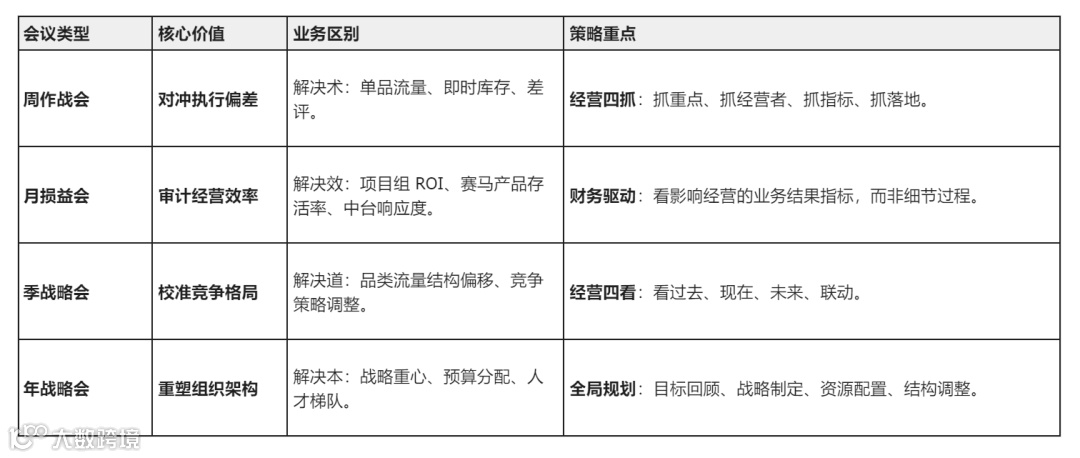 季会(方向引导):跳出日常琐事,看清品类格局与对手变动,决定中台资源(如 500 万备货资金)往哪个项目组倾斜。