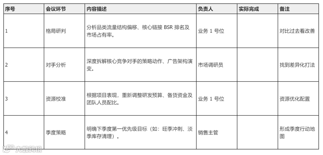 会议内容:分析过去一季业务成果、行业趋势、中长期目标校准。