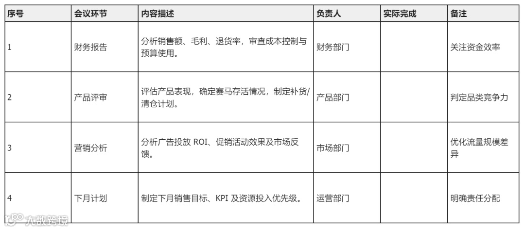 会议内容:财务报告、产品/库存回顾、营销效果分析、对手洞察。