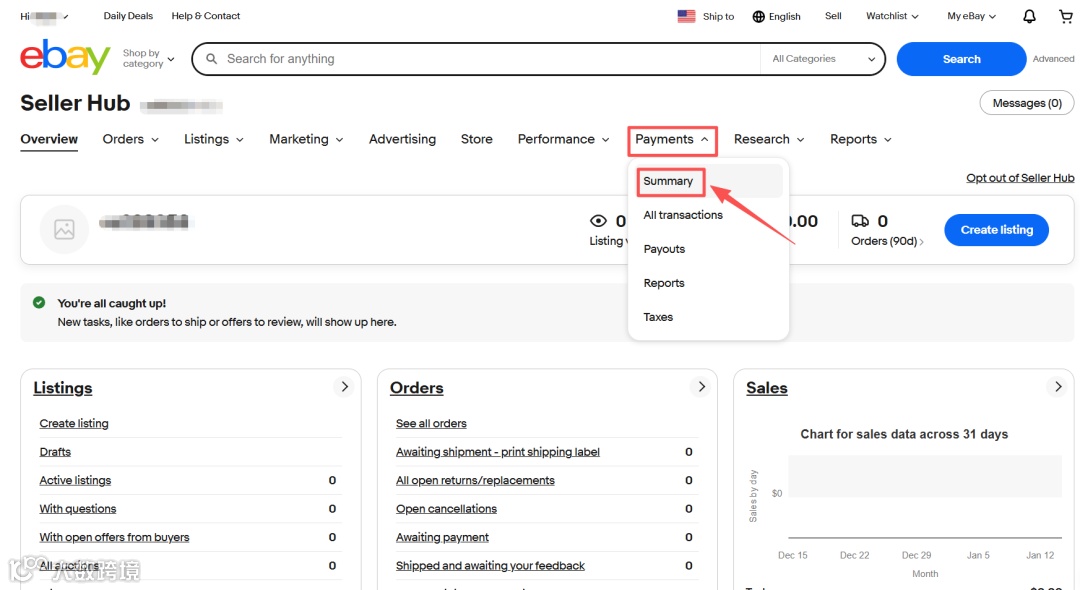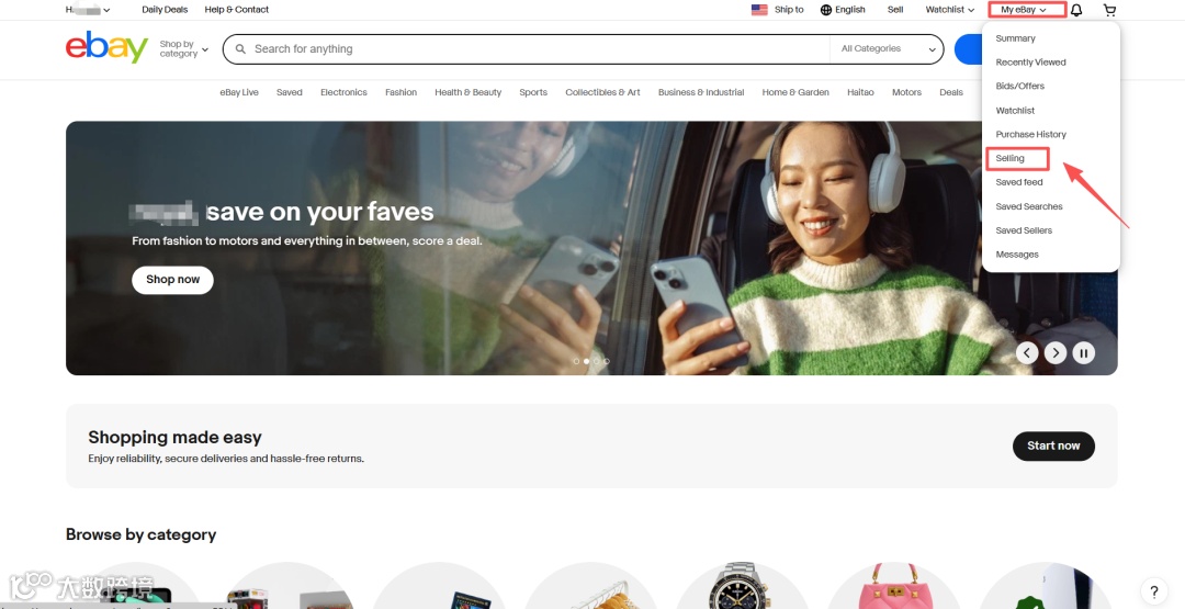 设置完店铺信息和上架完产品后,卖家就可以绑定收款账号了。具体流程如下: (1)在主页右上角“My ebay”中点击“Selling”,进入卖家中心页面。