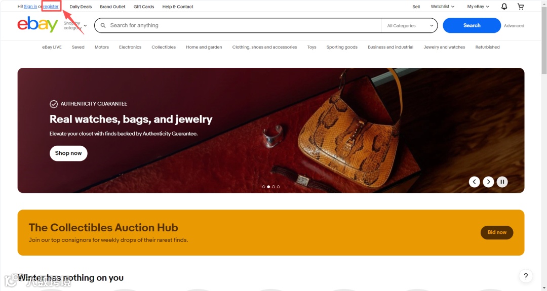 (1)打开ebay官网,在左上角点击“register”进行注册。