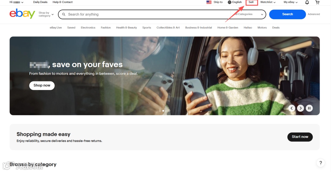 (1)在ebay主页中,点击右上角“sell”,开始上架商品。