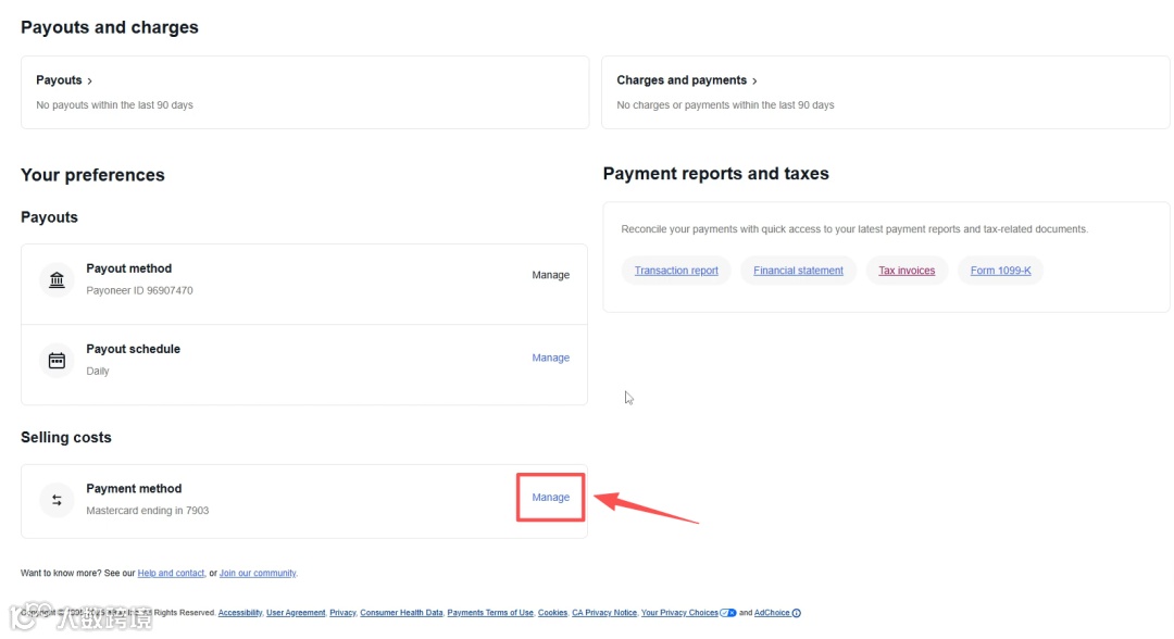 (3)划到页面下方,在“Selling costs”—“Payment method”,点击右边蓝色字体“Manage”,绑定海外收款账号。
