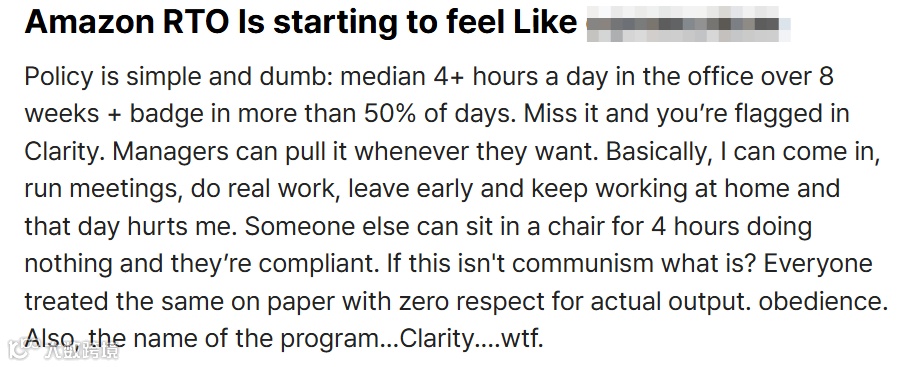 与此同时,越来越多员工对亚马逊严格的RTO政策表示不满。据悉,亚马逊对员工展开了非常严格的“监视”,强制要求员工每天至少待在办公室4小时。