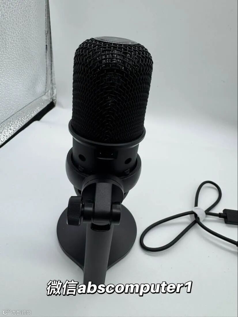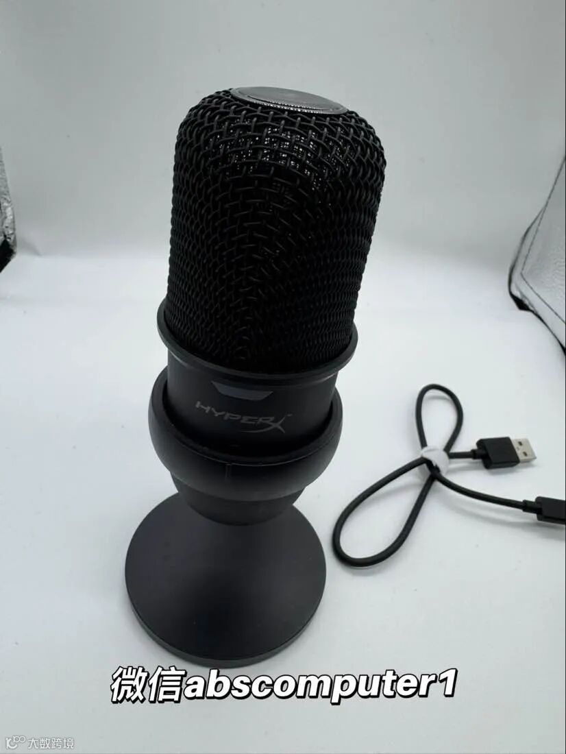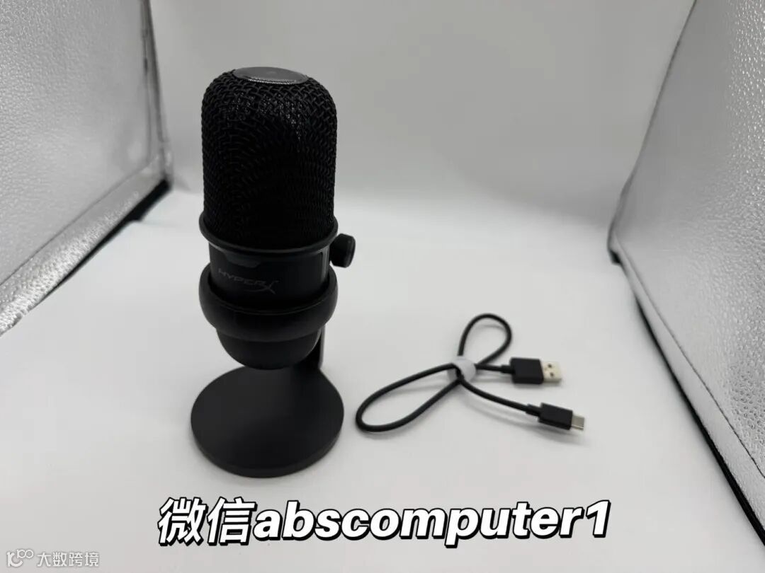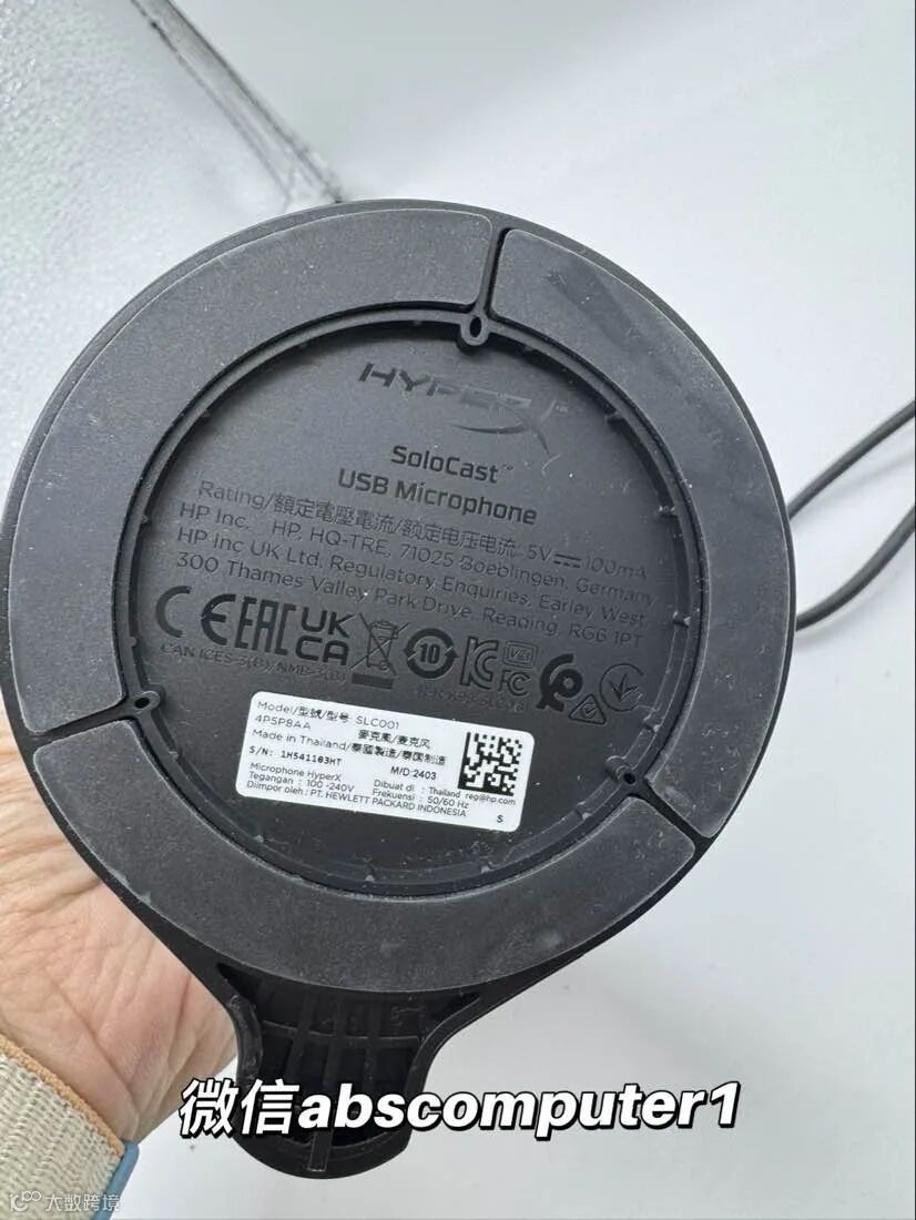 出一支 HyperX SoloCast USB 麦克风,型号 SLC001。