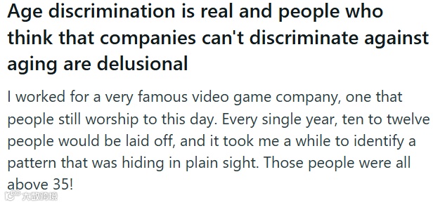 可以肯定的是:年龄歧视在美国职场并非完全不存在。一位资深工程师透露,之前所在公司每年都会裁掉部分35岁+员工……