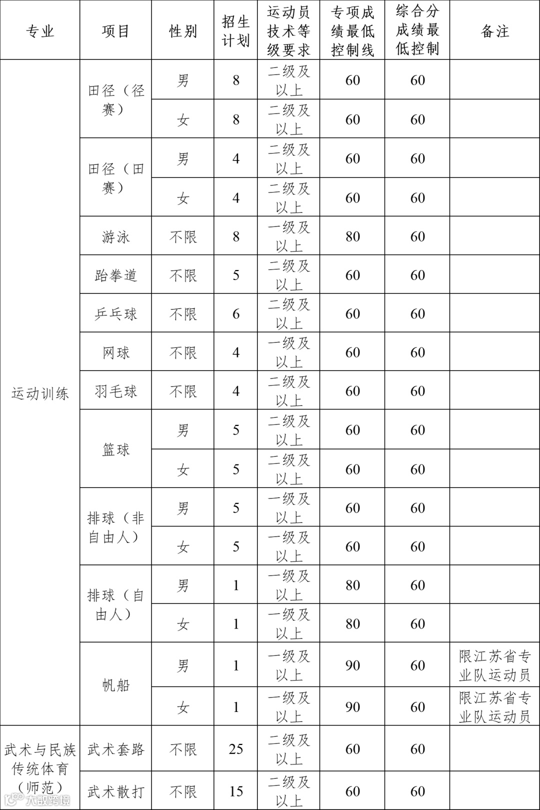 夏季项目(含武术与民族传统体育专业项目):