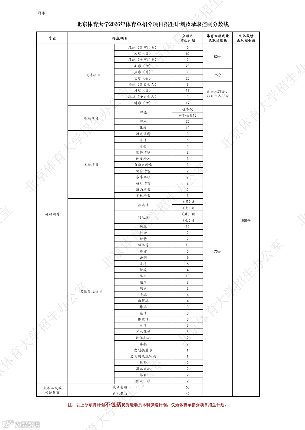 经学校研究决定,北京体育大学2026年运动训练、武术与民族传统体育专业文化成绩录取控制线为200分(一级运动员);足球项目体育专项成绩录取控制线为80分,篮球项目体育专项成绩录取控制线为75分,排球项目体育专项成绩录取控制线为83分(非自由人)和77分(自由人),其他项目体育专项成绩录取控制线为70分。