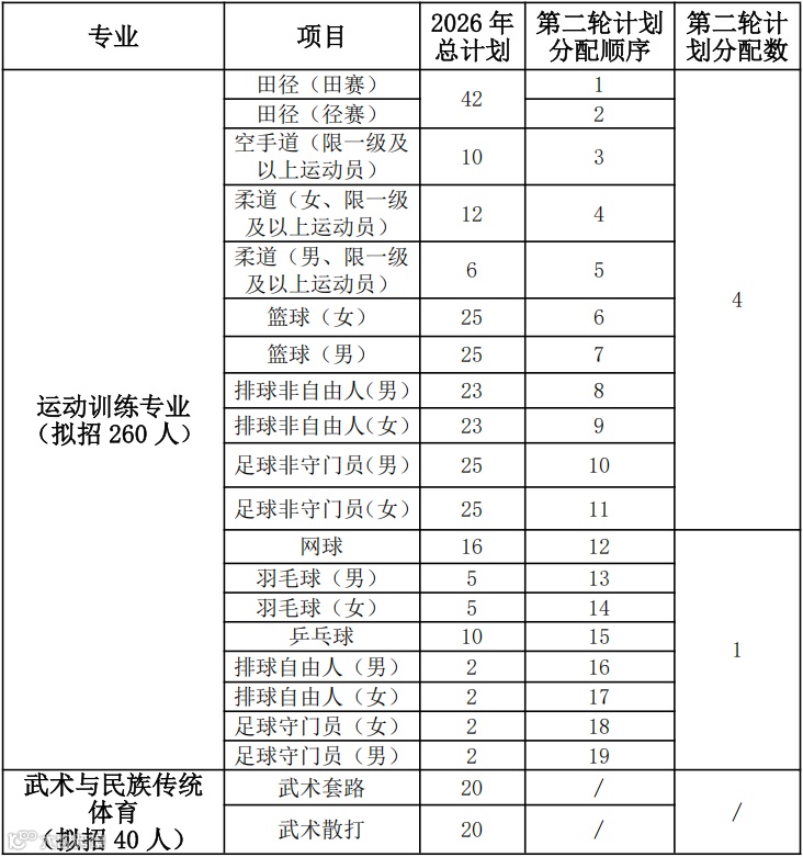 运动训练专业招生计划为260人,武术与民族传统体育专业招生计划为40人。