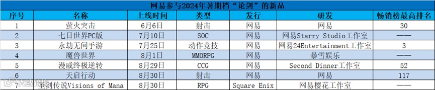 在这场游戏史上最卷暑期档中,网易成为派出参赛选手最多的厂商,总共多达7款新品在暑期档与玩家见面(见下表)。