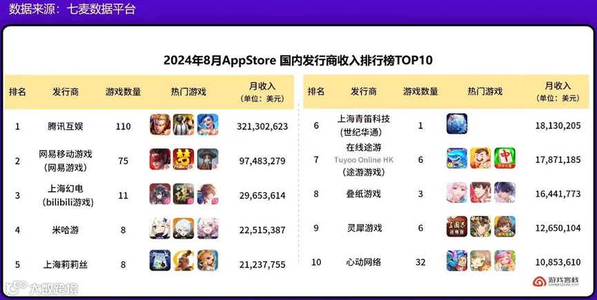 在不考虑名次只看名额的情况下,8月份 B站、莉莉丝及世纪华通进入TOP10,并取代了5月份的鹰角网络,大梦龙途以及Ark Game(途游的另一个账号)的名额,这正是暑期档新品大爆后带来的直观变化。
