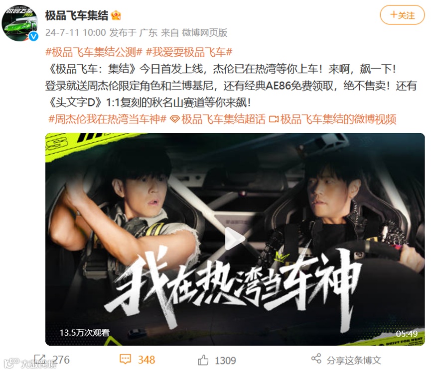 《极品飞车:集结》或许是腾讯参与暑期档大乱斗的最大牌产品,其不仅拥有知名单机游戏“极品飞车”IP,腾讯还邀请乐坛小天王周杰伦进行代言,甚至拍摄了宣传短片,安排周杰伦驾驶一辆经典的AE86引发了众多网友对《头文字D》的回忆。