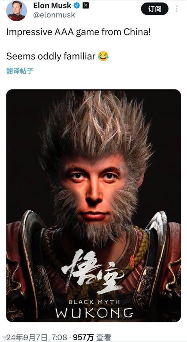 在国内,《黑神话:悟空》引来官媒到玩家的集体称赞,在海外,它也同样引发全球性轰动,比如美国知名企业家埃隆·马斯克就在社交媒体平台“X”上发布了一张“悟空版”AI照片,发文称“来自中国的令人印象深刻的3A游戏!似乎莫名熟悉”。