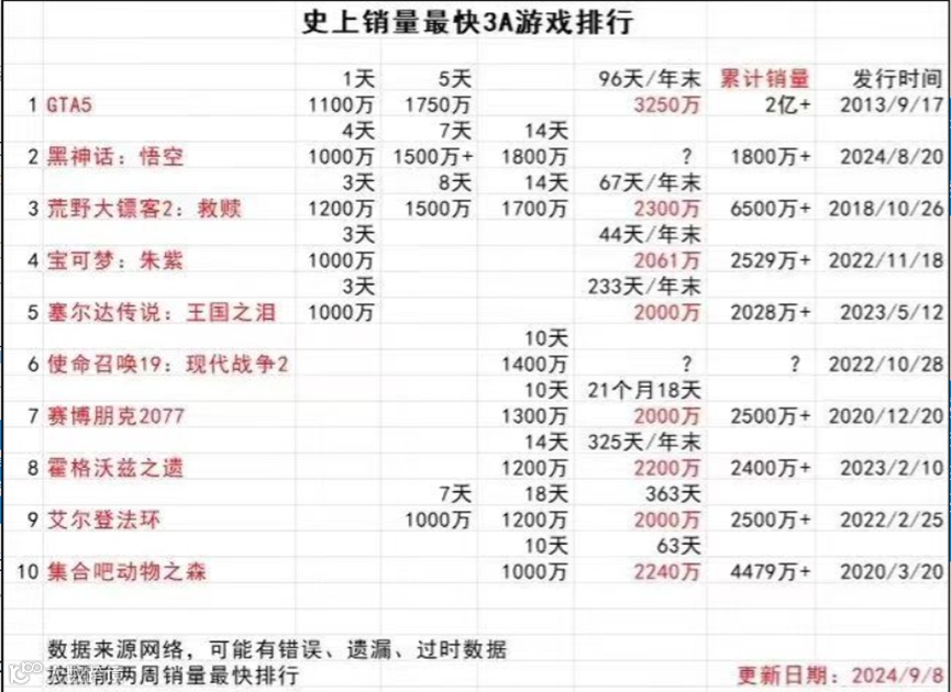 这样的销售成绩是什么水平?我们可以对比一下全球游戏史上销量最出色的买断制AAA游戏的销售成绩,如下: