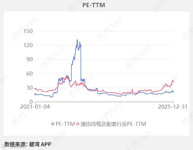 在2025年12月31日,中天科技的PE-TTM是21.58,而通信线缆及配套行业的PE-TTM是43.41,中天科技的PE-TTM远低于通信线缆及配套行业的PE-TTM。