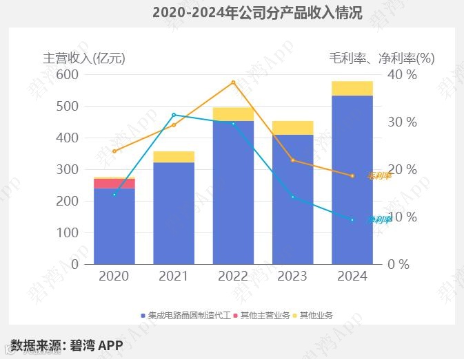 2024年公司的主营业务为集成电路行业,其中集成电路晶圆制造代工为第一大收入来源,占比92.13%。