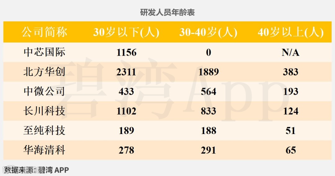 北方华创是30岁以下员工最多的公司,为2311人,占总研发人数的50.43%,同时它也是是40岁以上人数最多的公司,为383人,占总研发人数的8.36%。