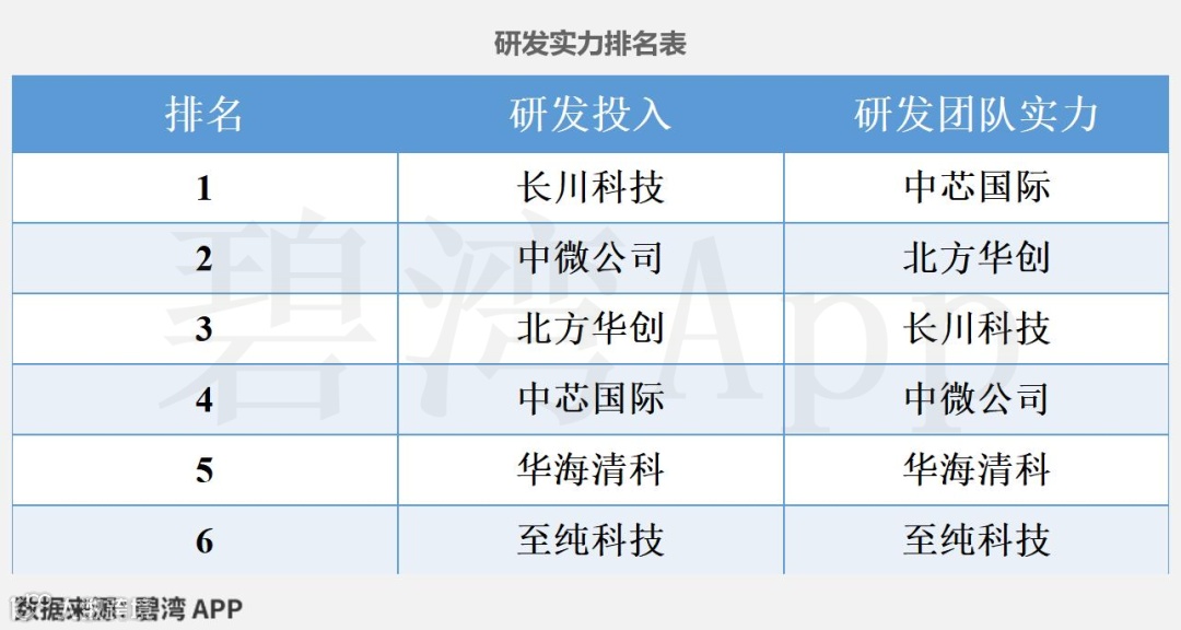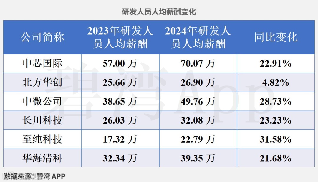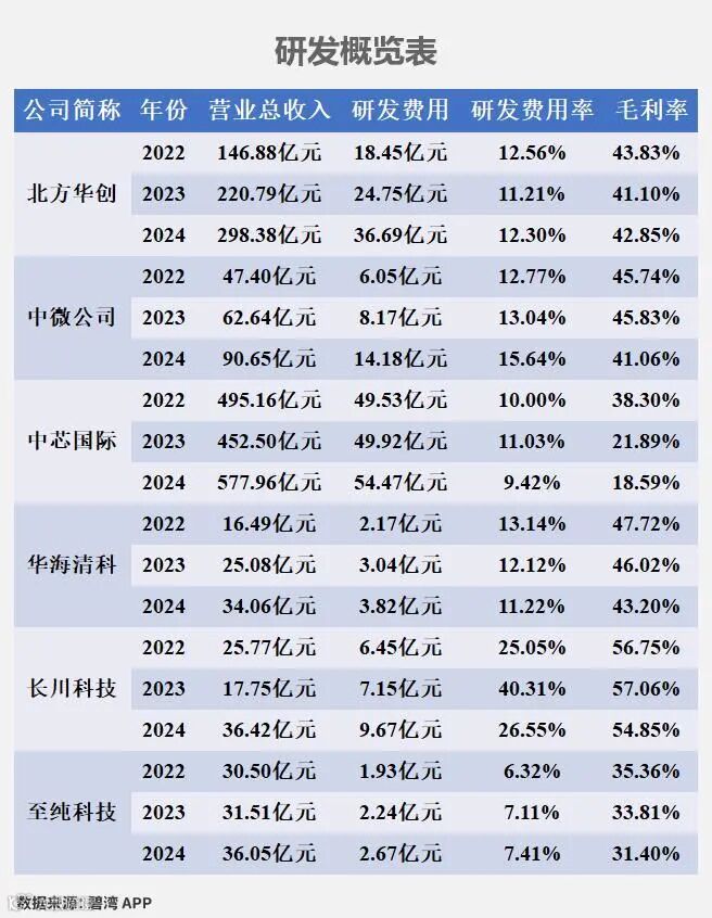根据北方华创(002371)、中微公司(688012)、中芯国际(688981)、华海清科(688120)、长川科技(300604)、至纯科技(603690)公开披露数据,对6家公司的研发实力信息等数据统计如下。