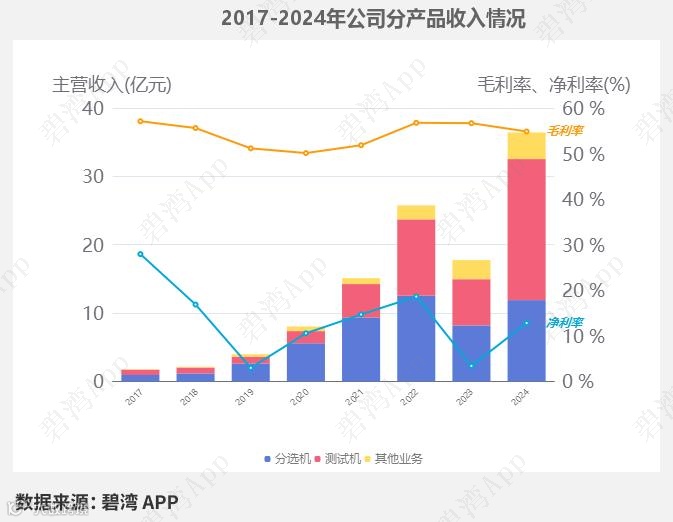 2024年公司的主营业务为集成电路电子工业专用设备,主要产品包括测试机和分选机两项,其中测试机占比56.64%,分选机占比32.69%。