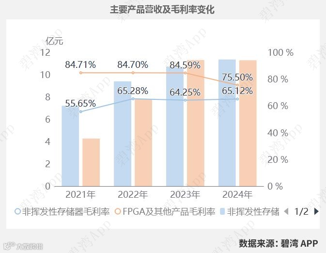产品毛利率方面,2021-2024年FPGA及其他产品毛利率呈小幅下降趋势,从2021年的84.71%,小幅下降到2024年的75.50%,2024年非挥发性存储器毛利率为65.12%,同比增长1.35%。