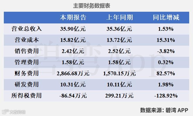 虽然营业总收入本期为35.90亿元,同比有所增长1.53%,不过毛利率本期为55.95%,同比小幅下降了5.26%,导致主营业务利润同比下降。