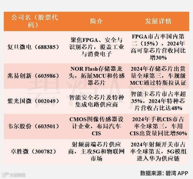 复旦微电在国内FPGA(现场可编程门阵列)领域居领先地位,2024年FPGA市占率约15%,智能卡芯片市占率超20%。其高可靠芯片在航天、金融等领域形成技术壁垒,但AI芯片领域份额不足5%,面临头部企业挤压。
