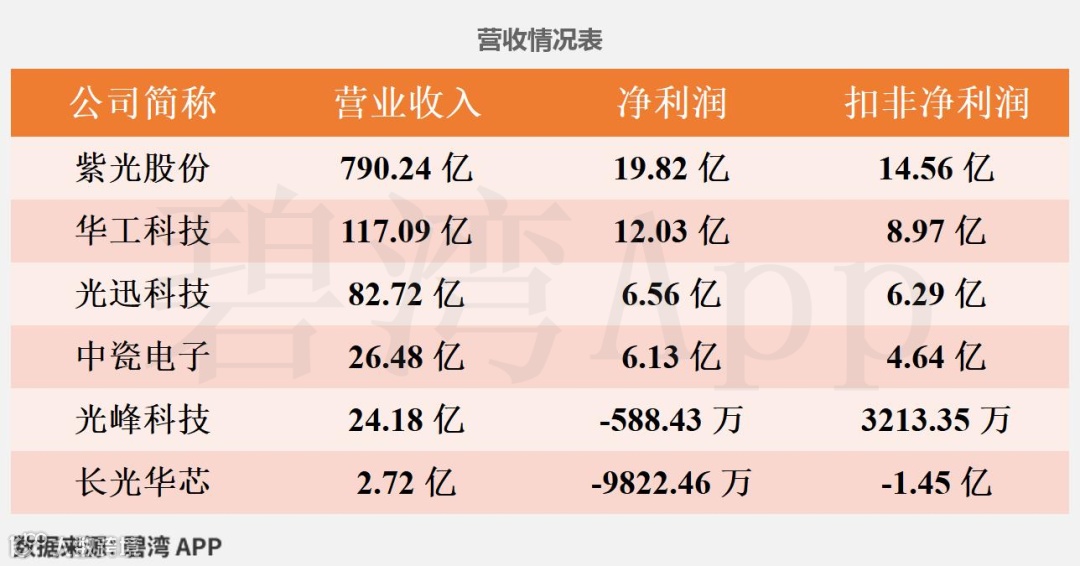 紫光股份以790.24亿的营业收入和19.82亿的净利润位居前列,显示出其在行业内的领先地位。华工科技和光迅科技也表现出色,分别实现了117.09亿和82.72亿的营收,净利润分别为12.03亿和6.56亿。相比之下,中瓷电子虽然营收仅为26.48亿,但净利润达到6.13亿,显示出较高的盈利能力。然而,光峰科技和长光华芯则面临亏损,尤其是长光华芯,净亏损达9822.46万,扣非净利润更是亏损1.45亿,反映出其在当前市场环境下所面临的经营挑战。