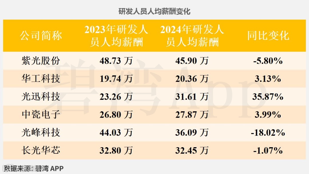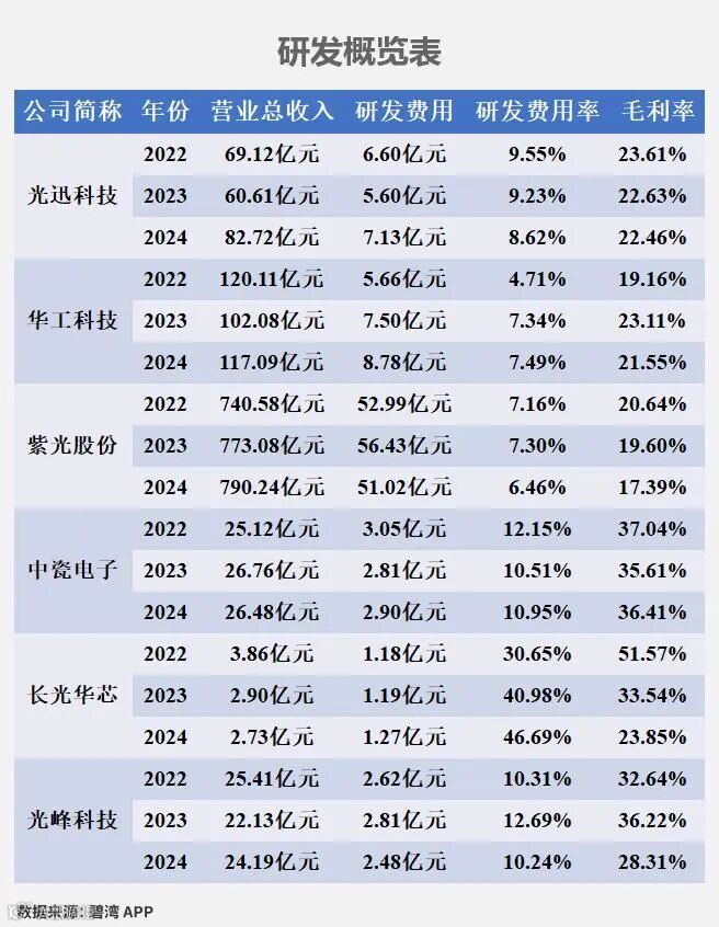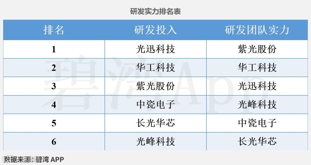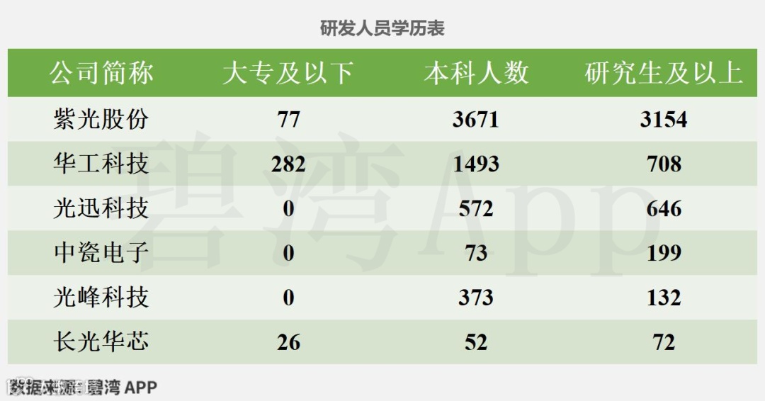 根据光迅科技(002281)、华工科技(000988)、紫光股份(000938)、中瓷电子(003031)、长光华芯(688048)、光峰科技(688007)公开披露数据,对6家公司的研发实力信息等数据统计如下。