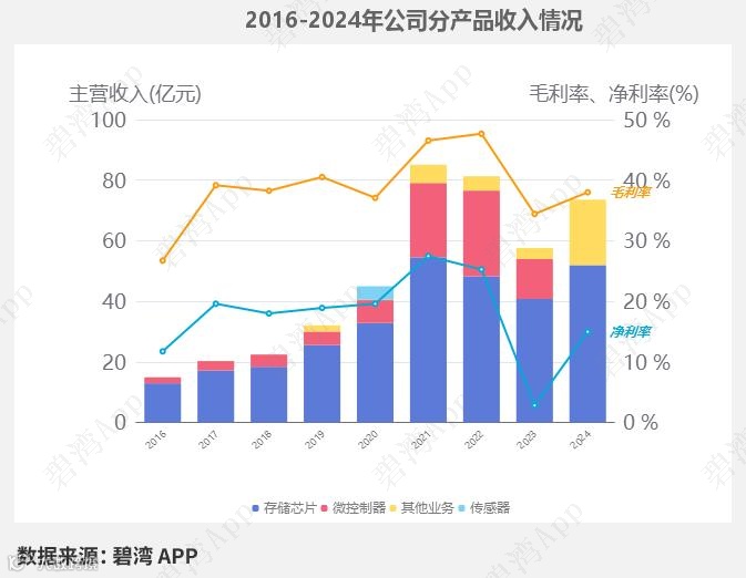 2024年公司的主营业务为集成电路,主要产品包括存储芯片和MCU及模拟产品两项,其中存储芯片占比70.61%,MCU及模拟产品占比23.19%。