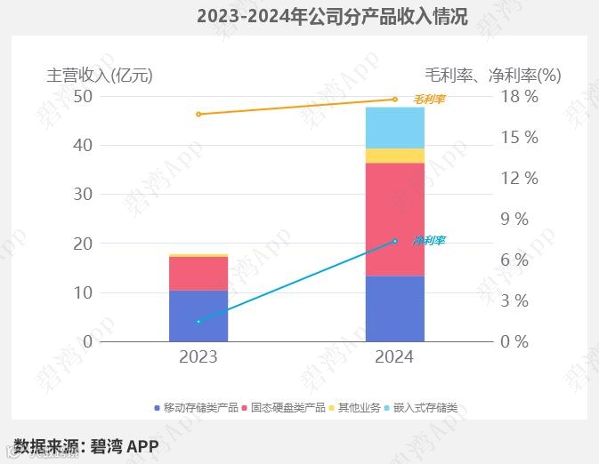 2024年公司的主要业务为存储行业,主要产品包括固态硬盘类产品和移动存储类产品两项,其中固态硬盘类产品占比48.20%,移动存储类产品占比28.01%。