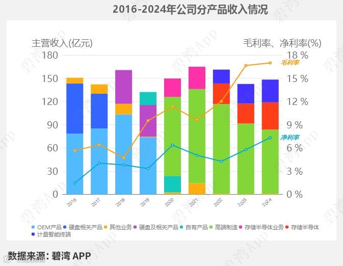 2024年公司的主营业务为计算机、通信和其他电子设备制造业,主要产品包括高端制造和存储半导体两项,其中高端制造占比55.93%,存储半导体占比23.75%。