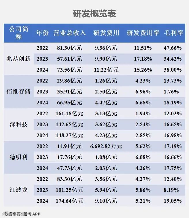 兆易创新、佰维存储、德明利、江波龙近两年毛利率上升但研发费用率下降。