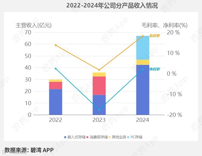 2024年公司的主营业务为集成电路,主要产品包括嵌入式存储和PC存储两项,其中嵌入式存储占比63.34%,PC存储占比30.15%。