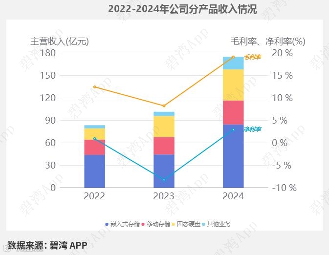 2024年公司的主营业务为存储行业,主要产品包括嵌入式存储、固态硬盘、移动存储三项,嵌入式存储占比48.24%,固态硬盘占比23.75%,移动存储占比18.37%。